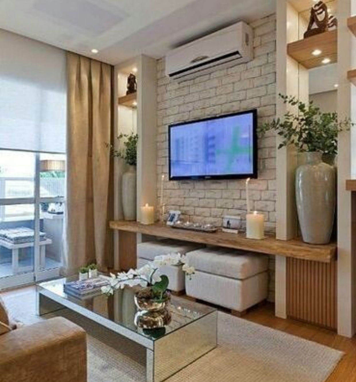 Интересно смотрится кирпичная стена. Она не только послужит источником тепла, но и выделит уголок для телевизора.