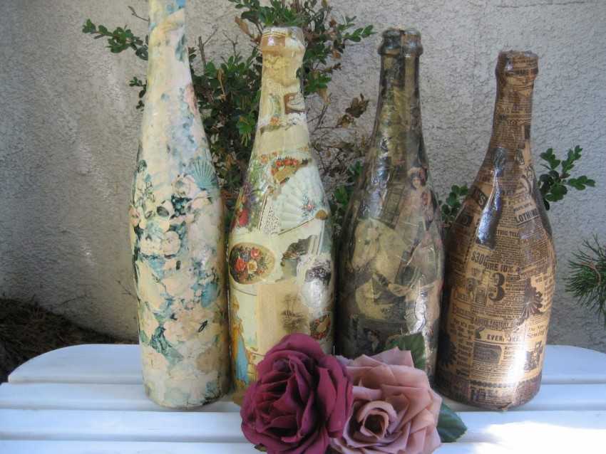 Чтобы создать уникальный интерьерный декор можно использовать обычные бутылки интересных форм. Декупаж бутылок своими руками это прекрасная возможность превратить обычную вещь в оригинальную цветочную вазу, которую можно подарить или украсить ей свой дом.