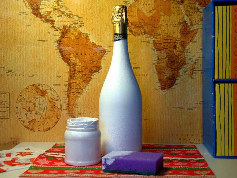 Как только раствор, сделанный из клеевого компонента и воды, полностью схватится и высохнет, поверхность нарядной бутылки надо будет прогрунтовать.