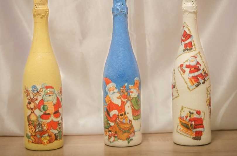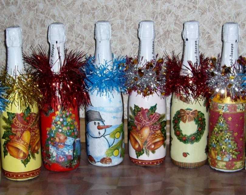 Перед началом выполнения задачи необходимо подготовить основные и вспомогательные материалы. Можно выбрать различные праздничные варианты в оформлении, но немаловажным остается бюджет. Волшебно выглядят изделия с рельефной пастой, глиттерами, стразами – идеальное изделие для праздника, но более затратное. Можно применять другие способы декорирования, для которых достаточно приобрести основные инструменты – декупаж бутылок салфетками.