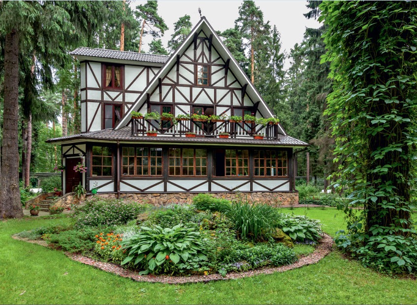 На большом земельном наделе существует уникальная возможность построить дом в глубине участка. Территория перед коттеджем находится полностью в распоряжении его хозяев. Она разбивается на две основные зоны: декоративный сад и место отдыха.