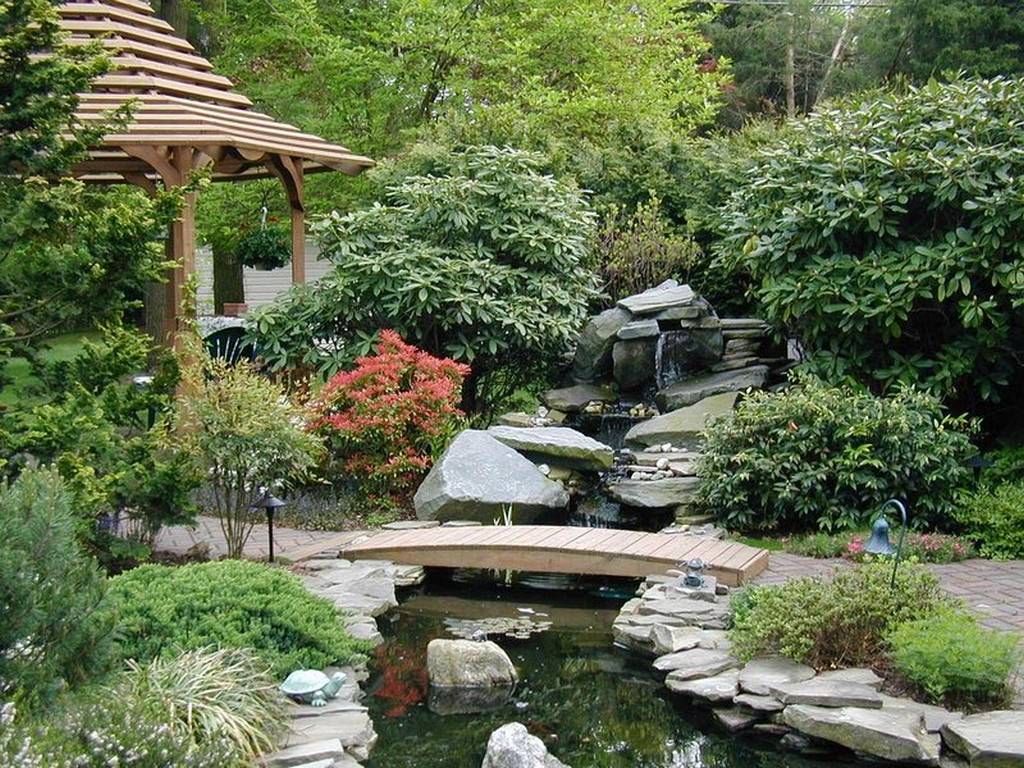 - Японский стиль включает в себя целую философию. Все предметы имеют смысл. Цвета не сильно яркие, строгих требований нет, обычно присутствуют различные камни, вода, красивые растения. Отлично впишется беседка во дворе частного дома.