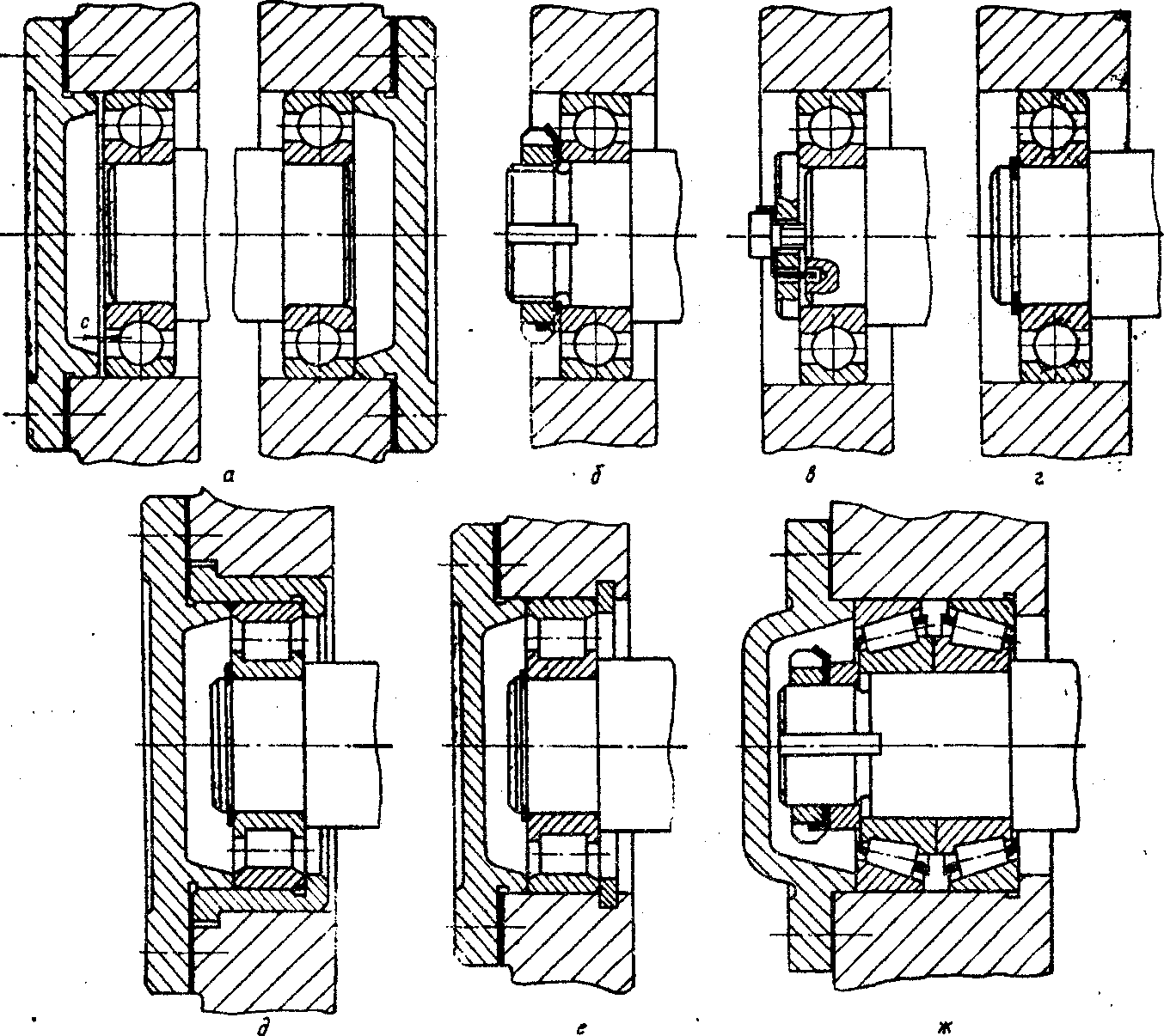 Другие поверхности смежных деталей должны отстоять от торцов колец подшипников для всех типов подшипников, кроме конических, не менее а=2 ÷ 3 мм (рис. 1, в).