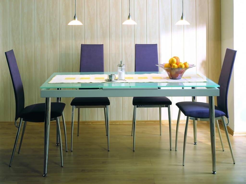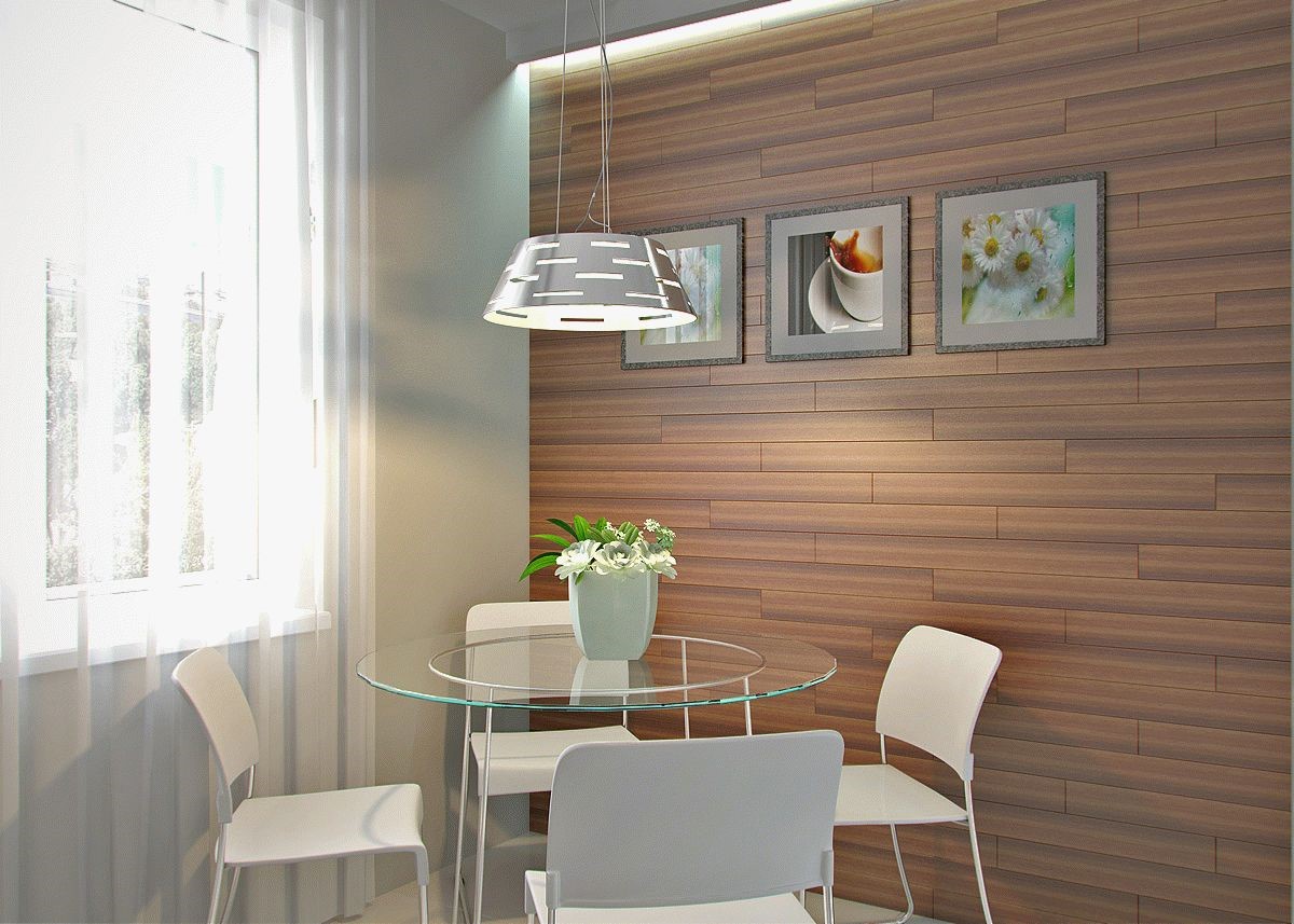 Еще одна актуальная идея. Подходит для кухонь с высокими потолками. Создает неповторимую рябь в обеденной зоне. Подчеркивает серьезность намерений хозяев дома. Такая стенка неплохо комбинируется темным столом и светлыми стульями под дерево. Прозрачный голубой светильник добавляет пространству уникальности и необычности.