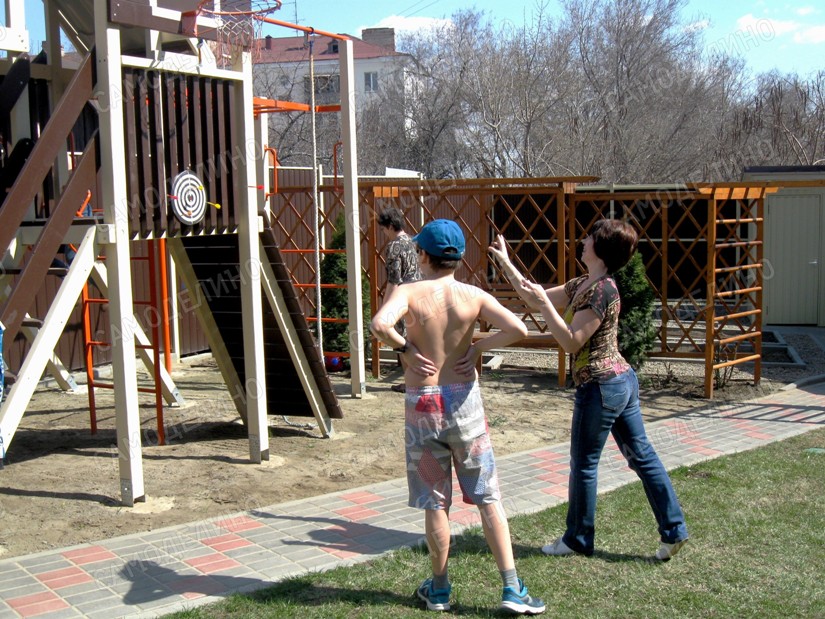 Покрытие под городком еще не устроено, но в дартс уже можно играть. В дальнейшем, после выравнивания поверхности, прямо на землю будет уложен искусственный газон.