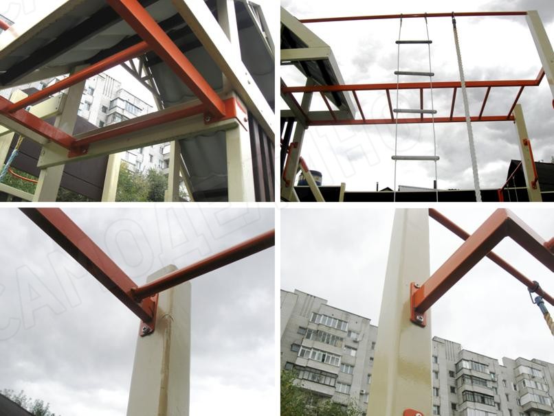 Горизонтальная опора для веревочной лестницы крепится к брусу и торцевой доске саморезами. Предварительно на трубу необходимо надеть пластиковые кольца для лестницы и каната.