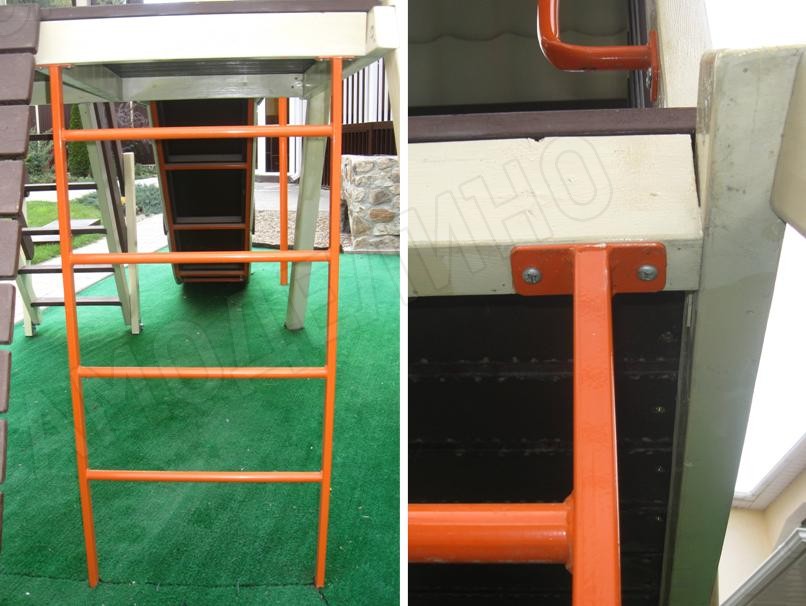 Горизонтальная лестница также крепится саморезами. Угловой элемент обеспечил надежное соединение с каркасом домика.
