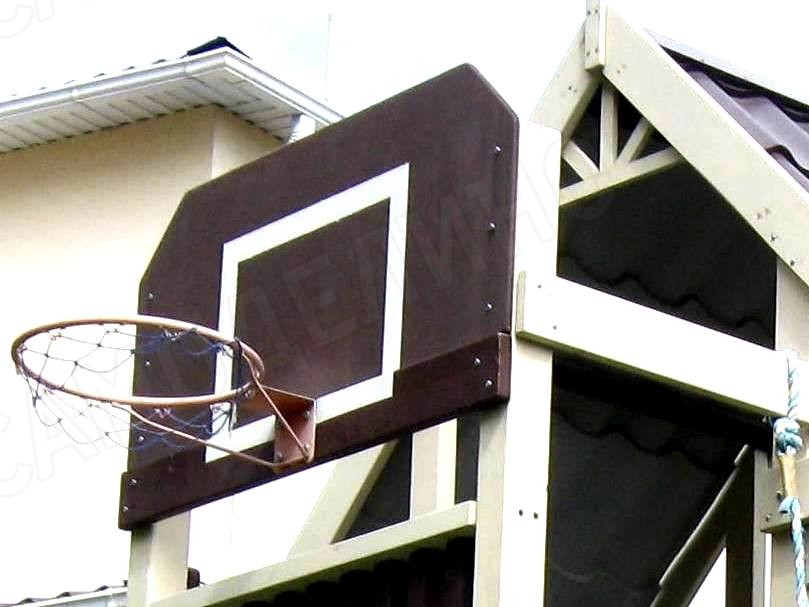 Баскетбольный щит выполнен из толстой фанеры. Для увеличения его размера снизу добавлена доска 120х30мм. Стандартное кольцо крепится за доску.