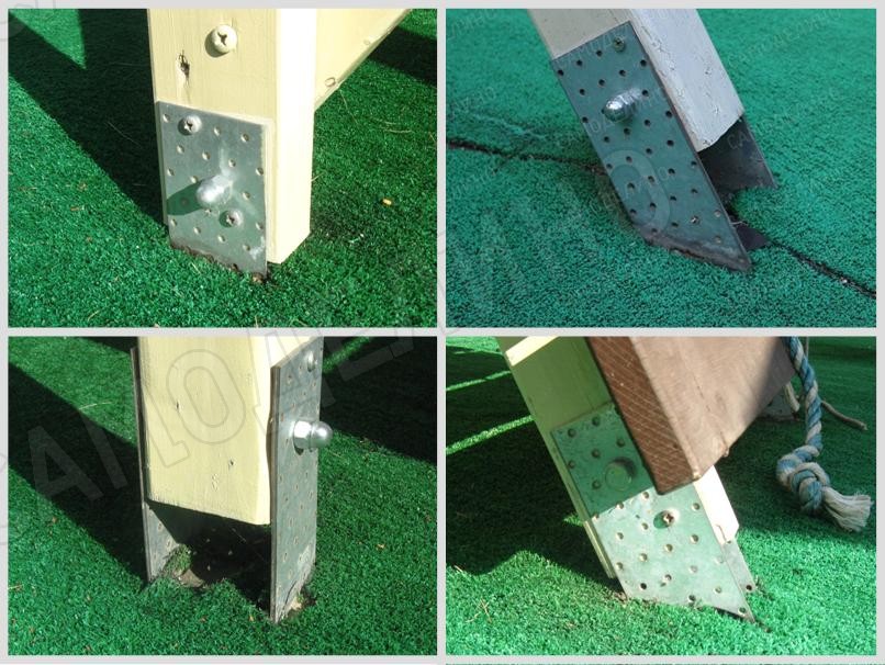 Прочие опорные элементы и турники монтируются после полного застывания бетона опор из бруса. На опоры сечением 90х45мм устанавливают по одной оцинкованной пластине с каждой стороны.