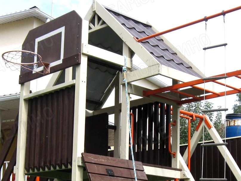 Наклонная площадка выполнена из досок сечением 120х30мм, закрепленных на опоры сечением 90х45мм. Накладки для лазания вырезаны из боковины автомобильной покрышки. За перила горизонтальной площадки привязан канат.