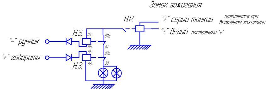 Если вы хотите, чтобы во время стоянки при включенном двигателе работали ближние, а не габаритные огни, то контакты необходимо «запараллелить».