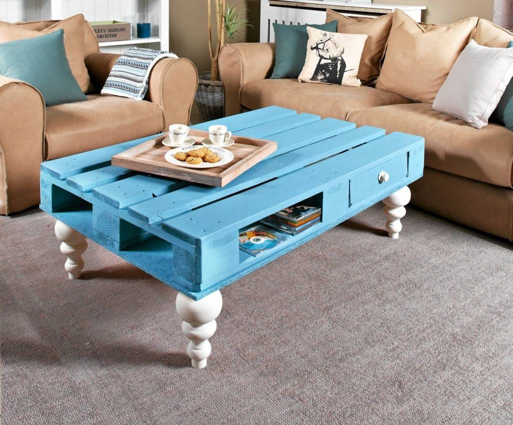Необычный яркий журнальный столик из паллет
