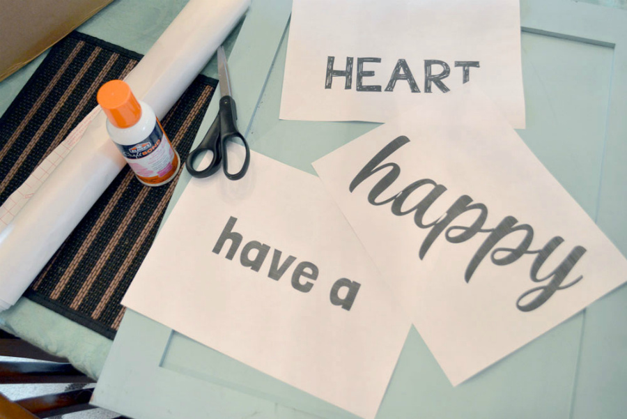 Вырежьте надпись и приклейте ее на обратную сторону цветной ткани или бумаги. Можно просто купить клеящиеся обои с мелким рисунком и наклеить на их липкую сторону надпись буквами вверх.