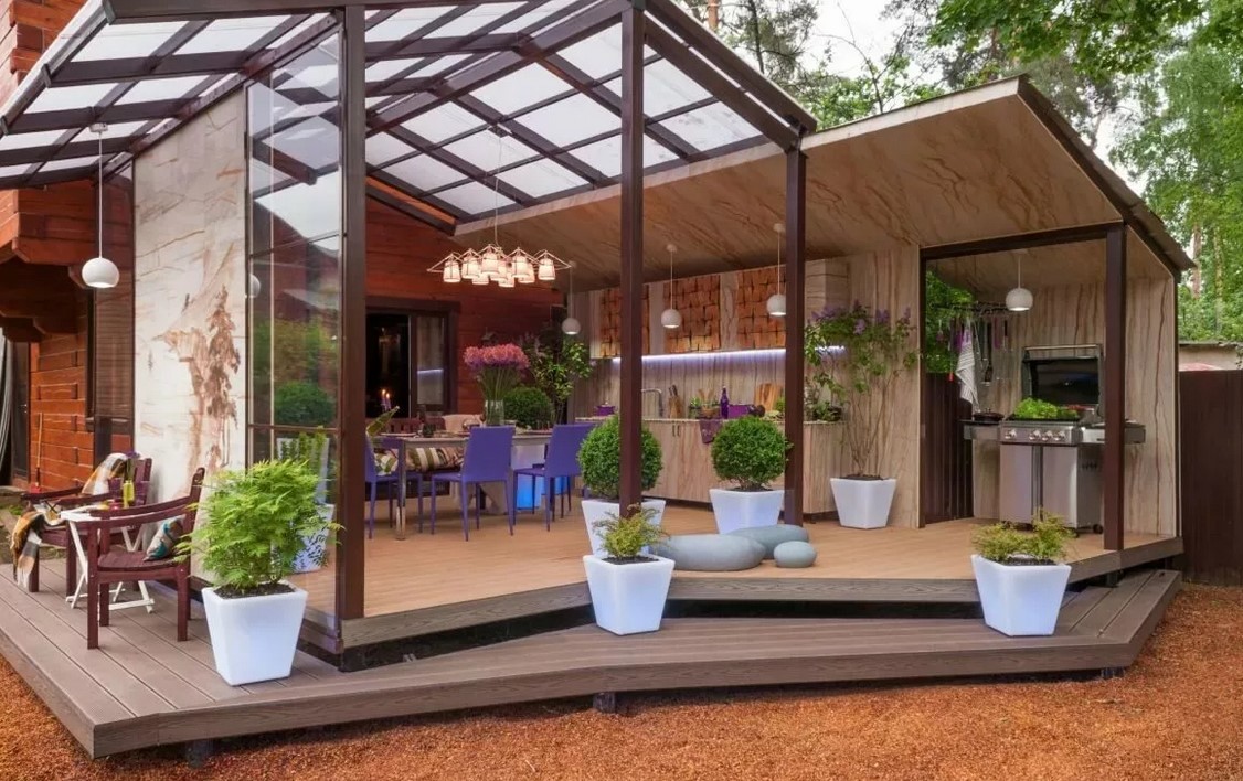 - открытого типа. Это площадка на качественном фундаменте, со стойками, крышей, ограждением. Стены могут быть частично зашиты в нижнем сегменте. Пристройку используют для летнего досуга или выращивания растений в теплый сезон;