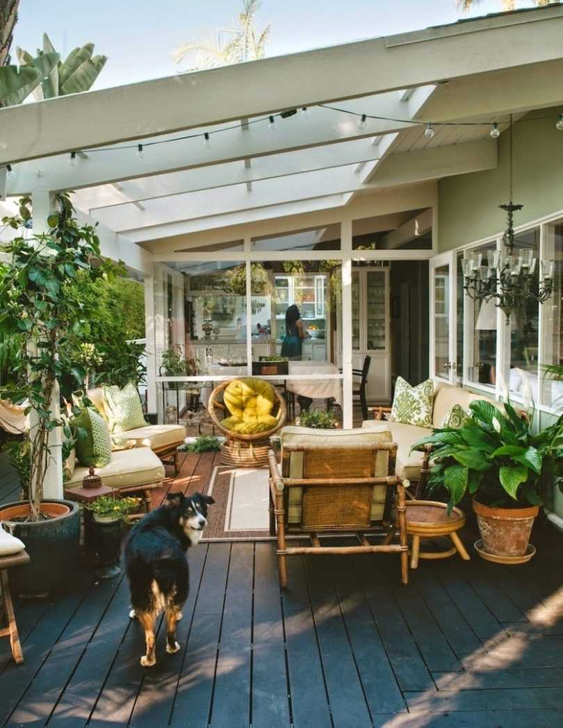 Внутри закрытых веранд можно запросто устраивать мягкие кресла, диван и ковер. Окна идут вместе с короткими занавесами. Если конструкция открытая, то она приветствует кресло-качалку, гамак и подвесные кашпо. Последние прекрасно смотрятся в зимнем саду.