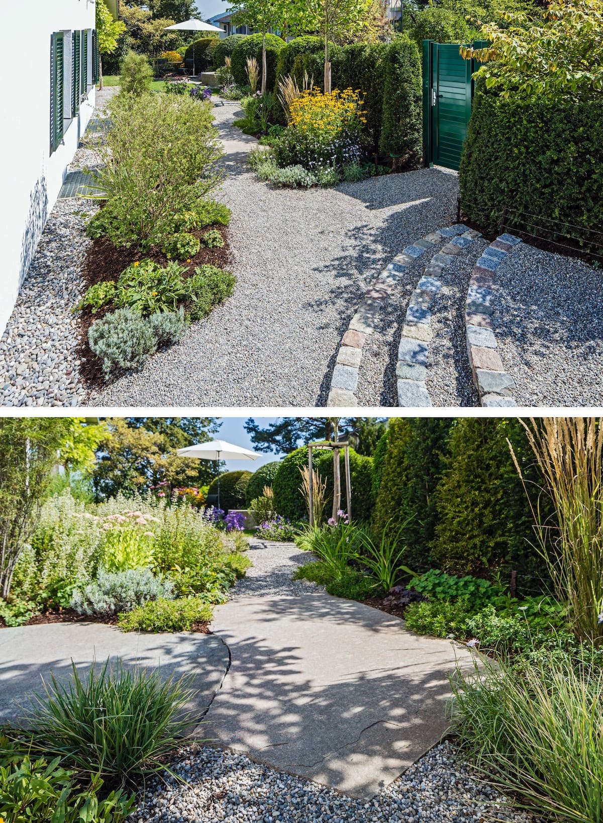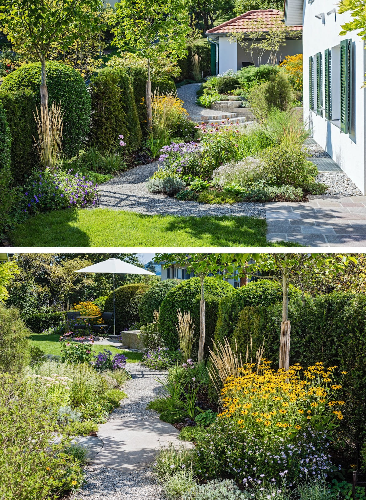 можно разделив участок различными по высоте живыми изгородями. Вечнозелеными
