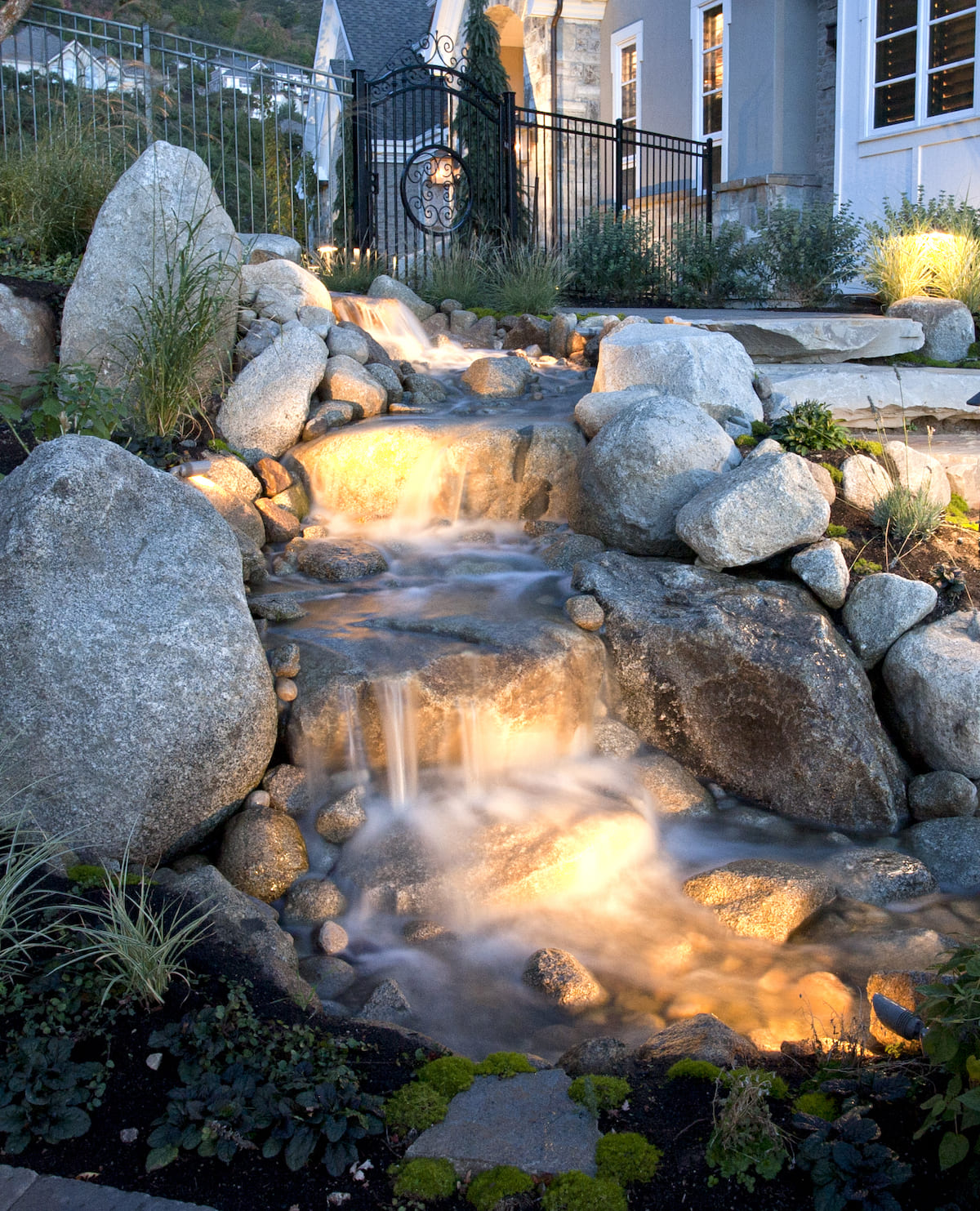 Кроме того, важное внимание уделяется подсветке растений, деревьев и кустарников. Светильники встраиваются в землю, и свет падает на растения снизу вверх