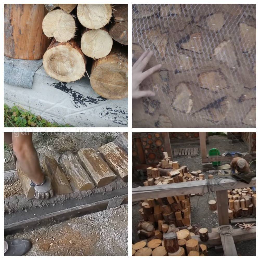 - Перед укладкой дрова пропитываются антисептиком. Можно дополнительно произвести обжиг паяльной лампой.