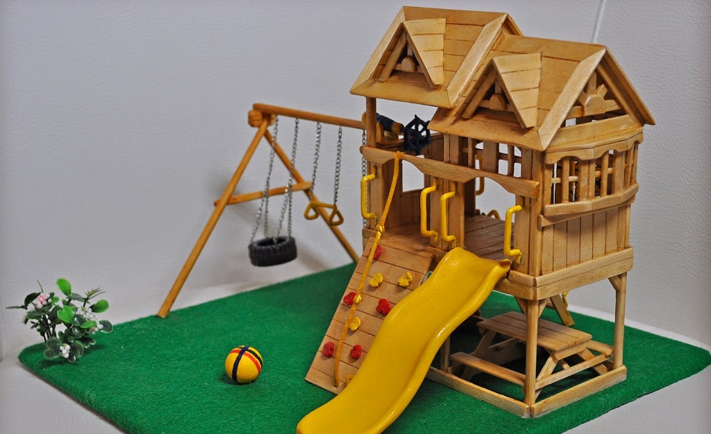 Деревянные палочки от мороженого – податливый, благодарный и доступный бросовый материал, поэтому из него без труда можно создавать и более сложные изделия. Очень эффектно смотрится домик из палочек от мороженого, который приведет вашу дочь в восторг!