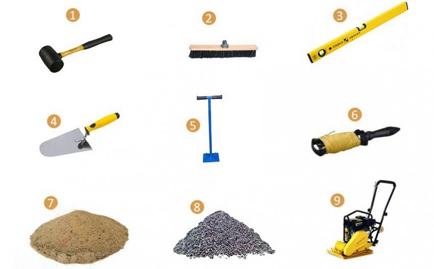 1 — резиновая киянка; 2 — щетка; 3 — уровень; 4 — мастерок; 5 — ручная трамбовка; 6 — отбивочный шнур; 7 — песок; 8 — щебень; 9 — вибротрамбовка.