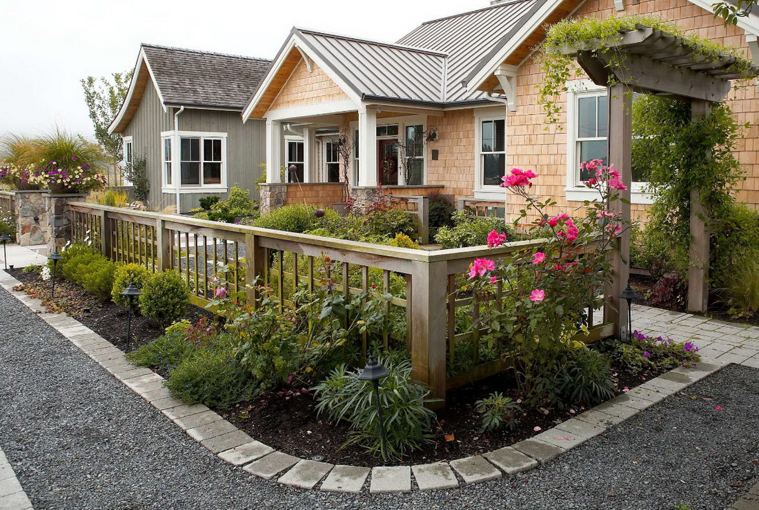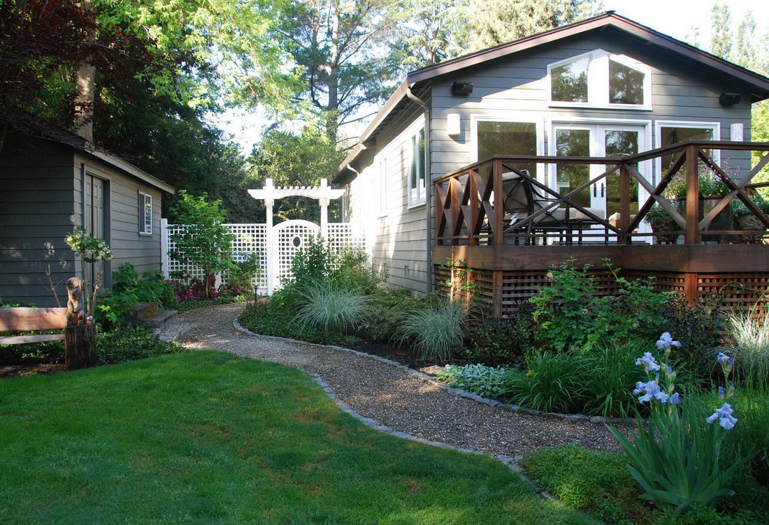 Такая дорожка проста в устройстве и оформлении, она будет прекрасно гармонировать с любым архитектурным стилем. Большинство дизайнеров именно таким образом предпочитают зонировать территорию.