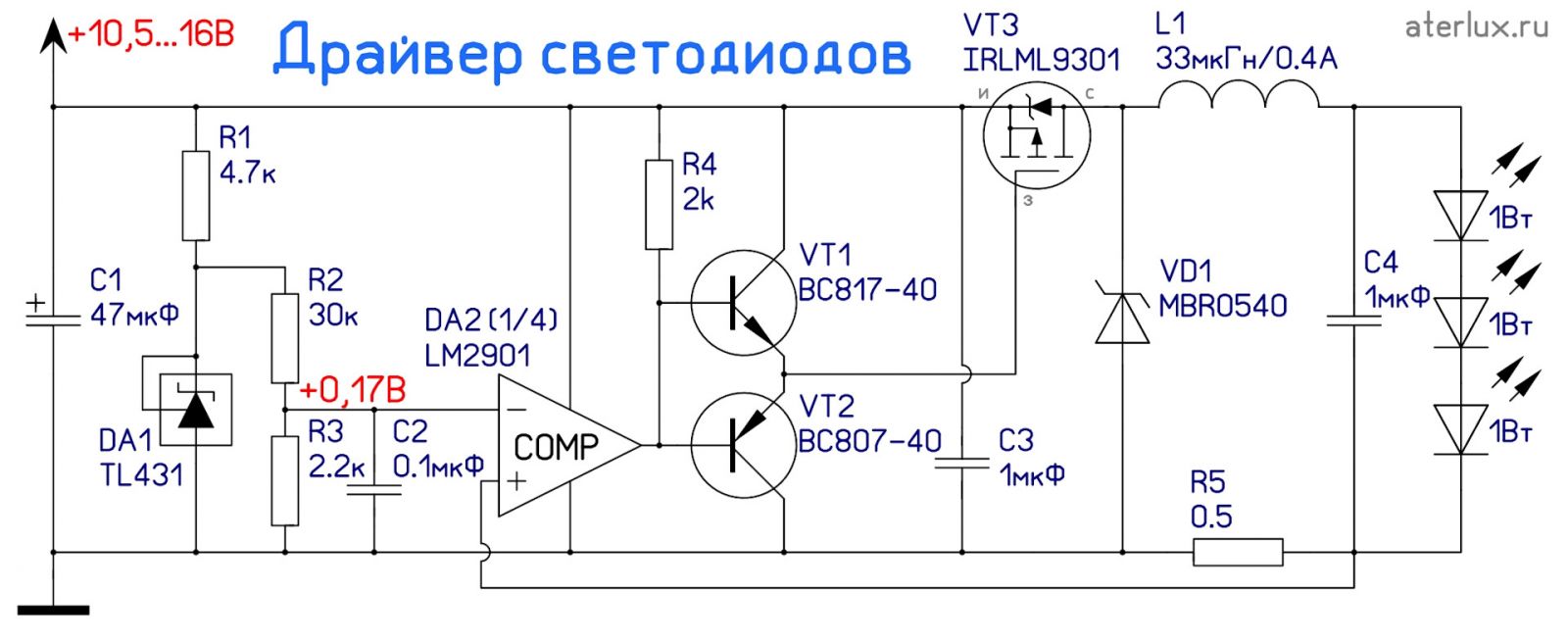 Основная работа драйвера – создание на выходе заданного значения тока и его поддержание. Любая схема подобного типа состоит из нескольких частей: