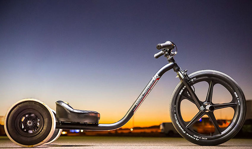 - Трицикл для дрифтинга Big Wheel Drift Trike. Эти модели пользуются успехом в дрифтинге. Это наверно самое лучшее изобретение в области дрифтинга. Вся конструкция выполнена из самых современных элементов. Рама выполнена из легкой легированной стали. Кроме этого спереди установлен двигатель с мощность 6,5 л.с. На задних колесах установлено покрытие из ПВХ, благодаря которому, обеспечивается идеальное скольжение во время заноса. Кроме этого на передней вилке имеется удобная подставка для ног. Однако есть один недостаток, это стоимость – она очень высокая. Но он действительно этого стоит, с такими качествами и функциями;