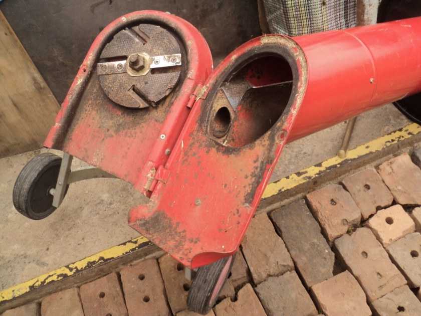 Чтобы измельчить траву в совсем мелкую фракцию, пользователь установил перед «выхлопной» трубой уголок.