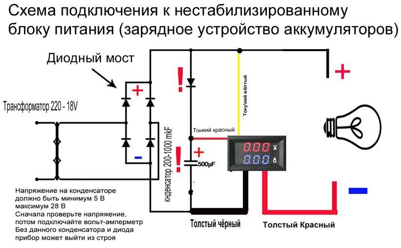 Подключение ампервольтметра из Китая к зарядному устройству сопровождается увеличением напряжения на конденсатор, в результате чего он может выйти быстро из строя. Поэтому при выборе прибора следует ориентироваться, чтобы его измерительная и питательная часть были запитаны раздельно.