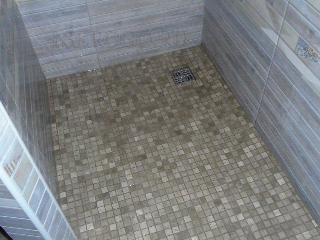 Самым простым в этой задаче будет облицовка дна мозаикой: какой бы формы не был трап и в какой бы точке поддона не располагался — переломы можно формировать как угодно,