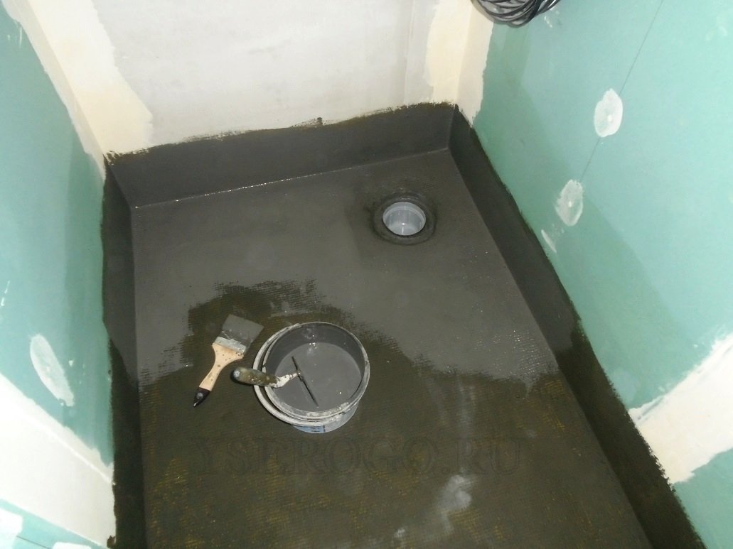 Гидроизоляционные работы относятся к числу важнейших операций во время строительства душевой кабины своими руками. Качественная гидроизоляция позволяет избежать протечек, развития патогенной микрофлоры, плесени и прочих вредных микроорганизмов. В качестве гидроизоляционного материала лучше использовать составы на основе битумной мастики. Данным средством обрабатывается вся поверхность кабины – стены, пол, перегородки. Нанесение происходит в 2 слоя, с интервалом между ними в два часа. Мы не будет тут подробно описывать как правильно все делать, у нас есть подробная полная статья по гидроизоляции с примерами, советами и фото.
