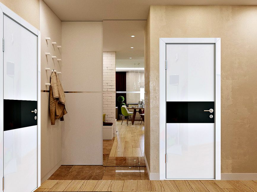 Темный деревянный пол не повод ставить и темные двери в интерьер. Гораздо эффектнее он будет смотреться, оттененный светлыми дверными полотнами. Чтобы поддержать общую идею присутствие светлой входной группы, в обстановку можно добавить: витражи, панно, стеклянные вставки, плинтуса, фурнитуру в напольных тонах. При необходимости дополнительно выделить светлые двери в интерьере или привязать их к дизайну пола, можно оформить проем темным наличником.