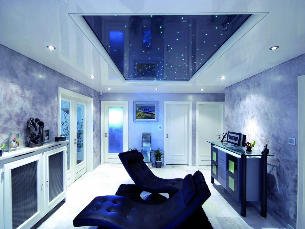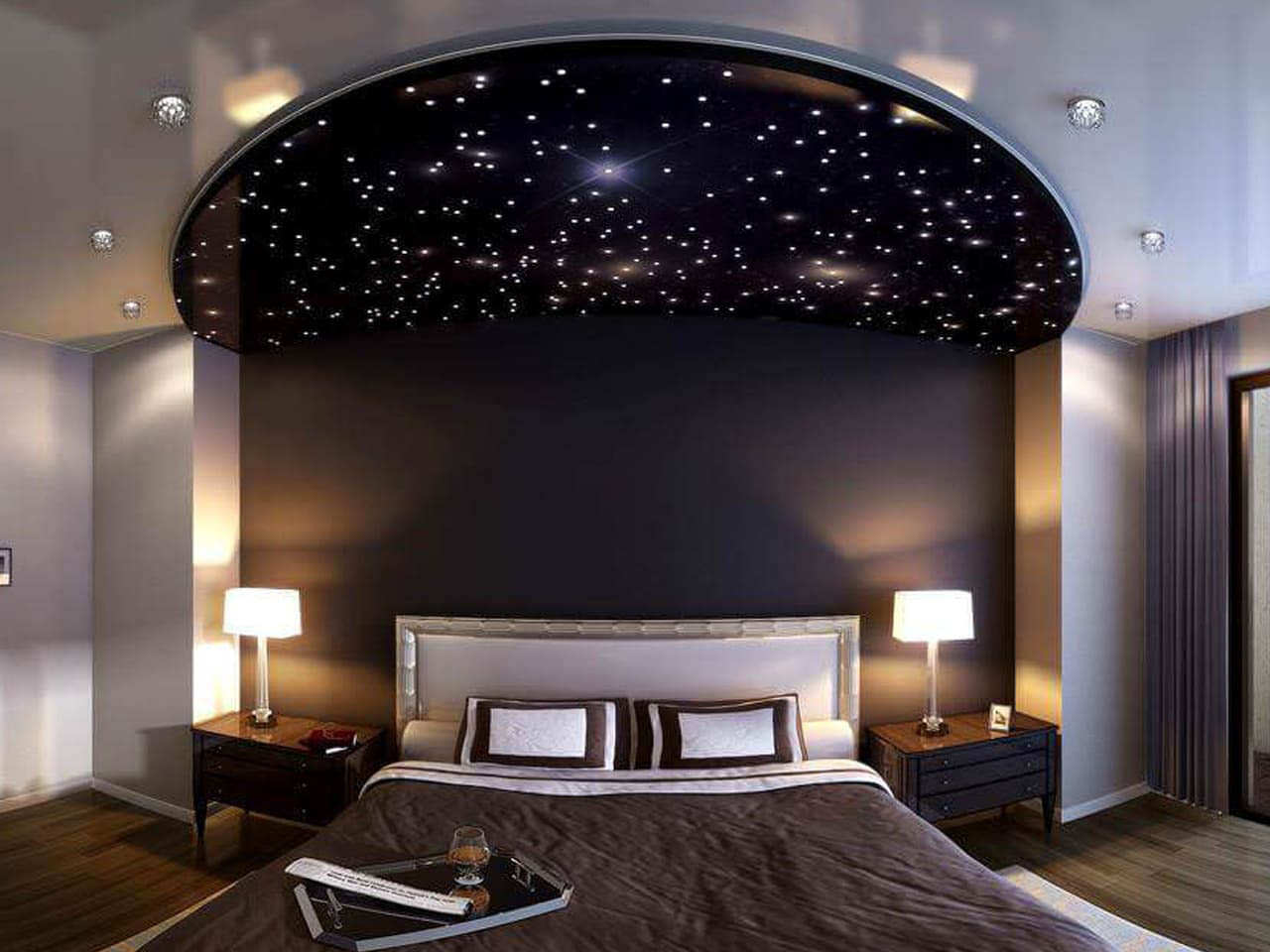 - Звездное небо. В таком потолке используется специальная система светодиодов, лампочек, светильников. Яркость и цвет свечения можно настраивать с помощью пульта.