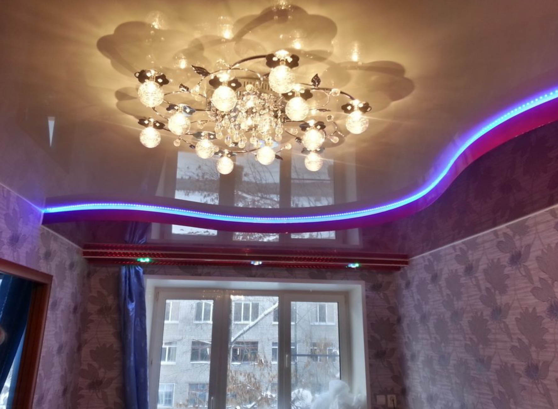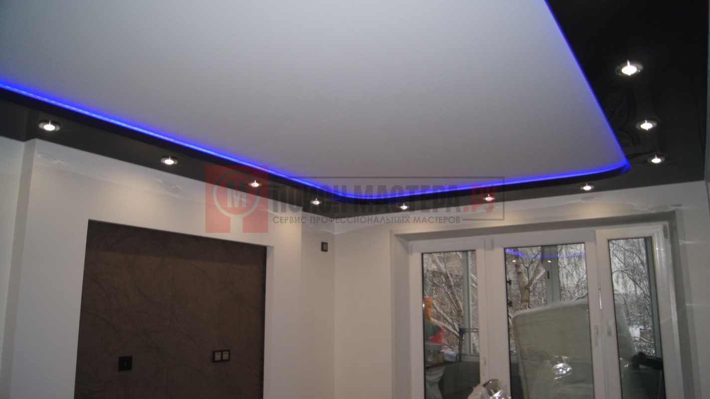 у дизайнеров появилась отличная возможность напрямую влиять на атмосферу в помещении, и натяжные двухъярусные потолки тут пришлись как нельзя кстати. Как правило, один из уровней размещается по периметру либо вдоль одной из стен и принимает активное участие взонировании помещения за счет размещения точечных светильников или светодиодных лет. Эти источники света относятся к категории дополнительных и помогают помимо выполнения непосредственной практической функции добиться художественного разделения единого жилого пространства на несколько функциональных зон.