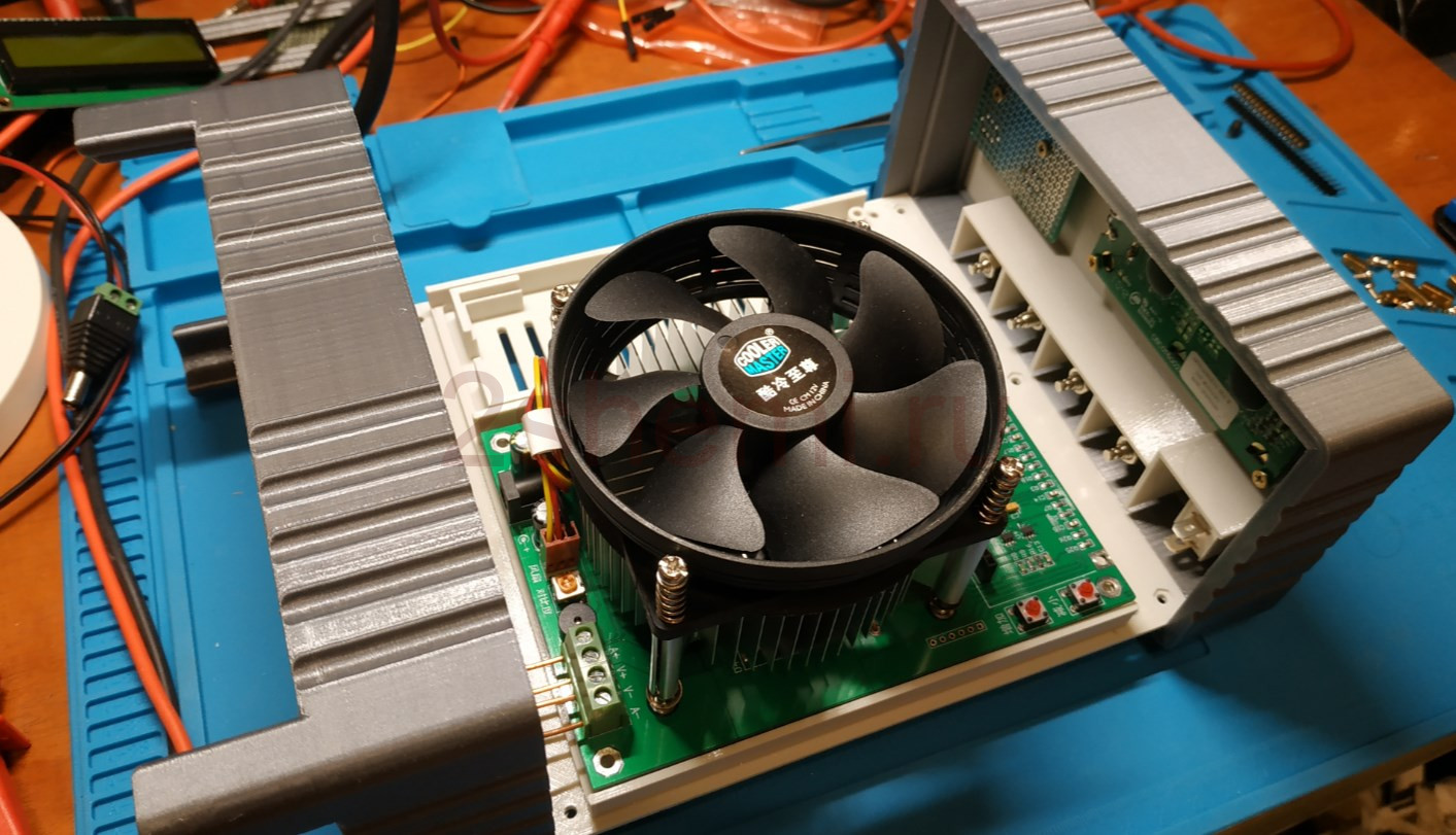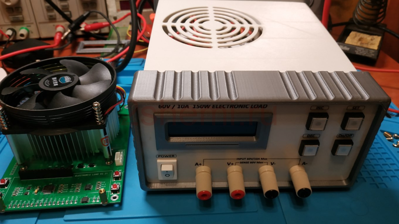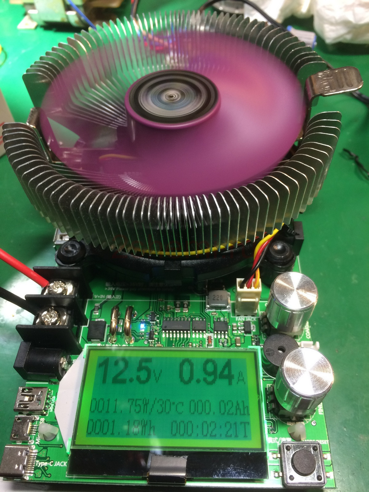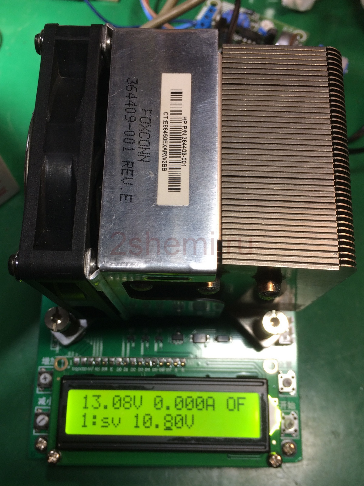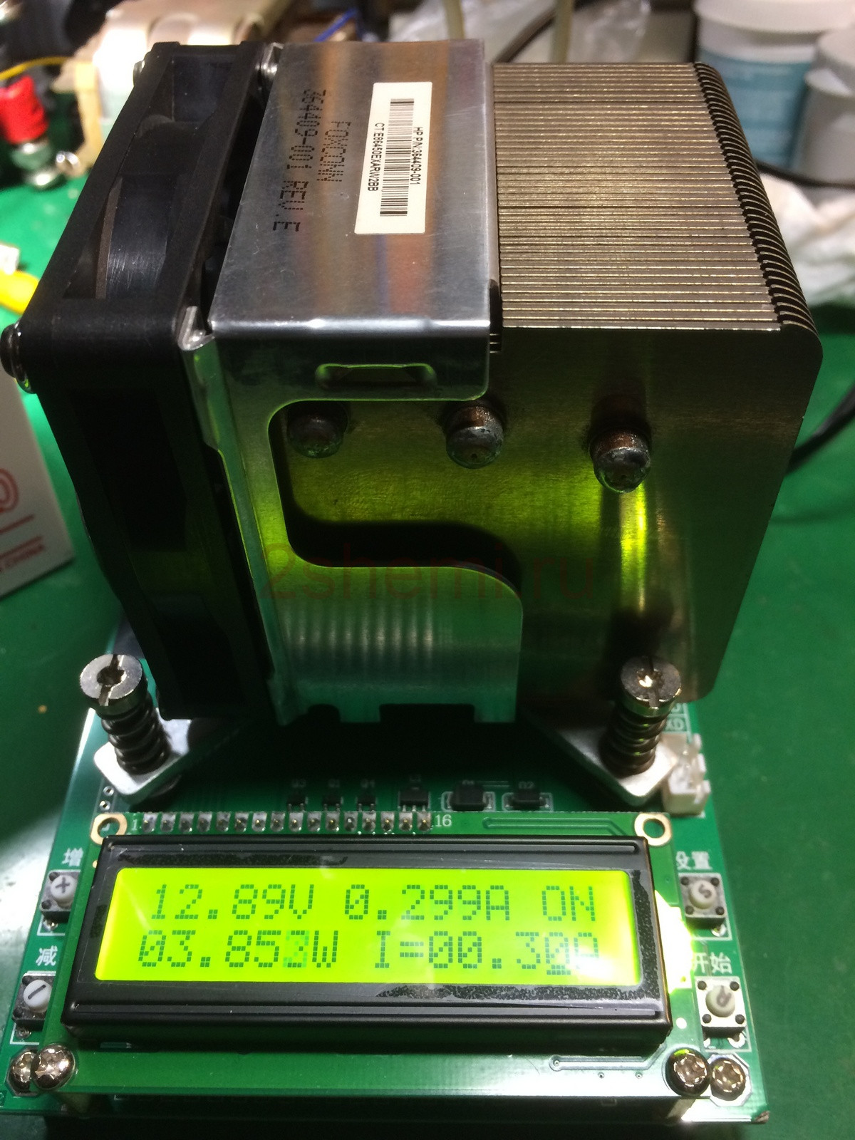 Тем не менее, установлен медный радиатор бОльшего размера с вентилятором. Такая сборка от компьютера значительно снизила температуру управляющего транзистора и соответственно меньше шансов повредить его при работе на максимальной нагрузке. В настоящее время такая электронная нагрузка стоит около 25 долларов на Али.
