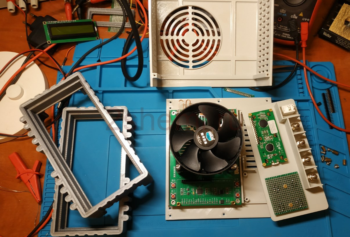 Устройство собрано из того, что было под рукой вперемешку от блоков питания, мониторов и даже старых советских радиодеталей. Полевой транзистор практически любой такой структуры с током более 5А и напряжением более 30В, например IRFZ34, 44 и аналогичные — что есть под рукой. Диодная сборка — от блока питания AT(X). Радиатор и вентилятор — от процессора (побольше). Для подачи напряжения имеет разъемы — стандартный Molex от винчестера (папа) и два винтовых.
