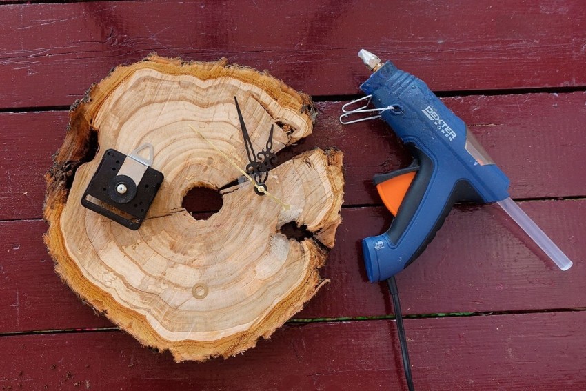 Шаг 3. Вырежьте посередине циферблата отверстие, установите часовой механизм так, чтобы крепеж был расположен по центру. Для фиксации механизма вырежьте из дерева/картона круг, диаметр которого соответствует диаметру пяльцев, и приклейте к нему механизм. Как вариант – механизм можно повесить на декоративную ленту, зафиксировав ее на пяльцах и сделав небольшую петлю, дабы вешать на стену часы. В конце установите стрелки. Все, наша оригинальная поделка готова!