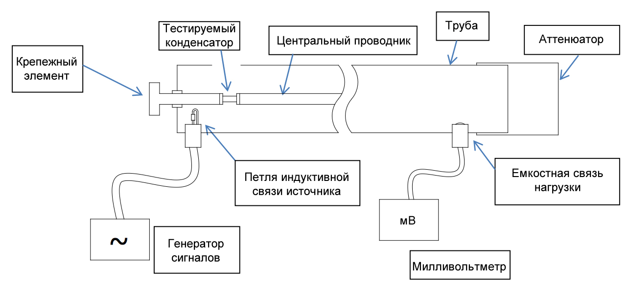 Линия коаксиального резонатора выполнена из медной трубки со сплошным медным стержнем в качестве центрального проводника. Тестируемый конденсатор устанавливается последовательно между центральным проводником и проводником экрана.