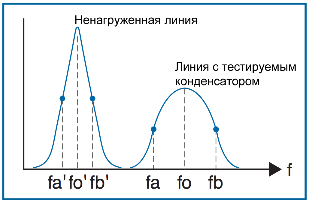 Затем тестируемый конденсатор помещается в секцию DUT (device under test, тестируемое устройство), и генератор сигналов настраивается на пиковое резонансное напряжение. Конденсатор вызывает изменение резонансной частоты и добротности, значения которых теперь отличаются от значений ненагруженной коаксиальной линии. Затем используются расчеты линии передачи, и значение ESR определяется на основе взаимосвязи между новой частотой и добротностью, а также частотой и добротностью исходного состояния без нагрузки.