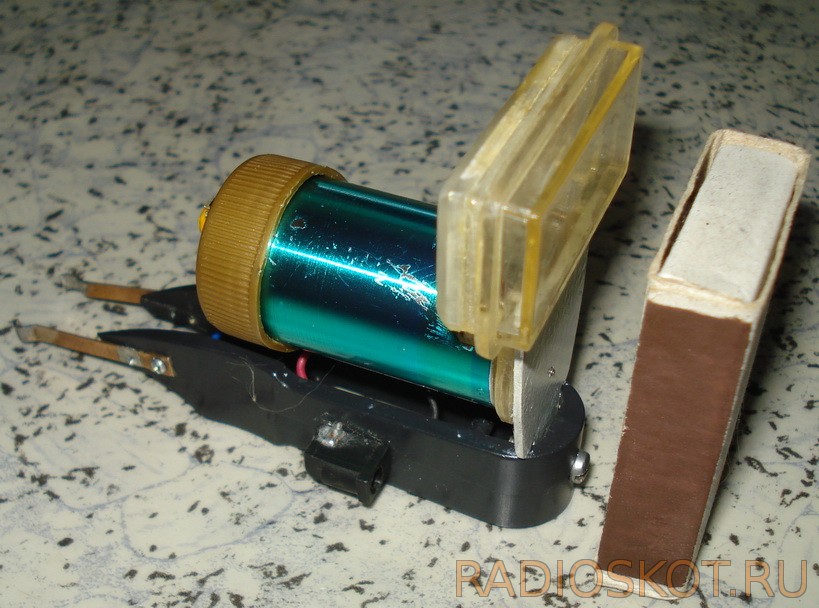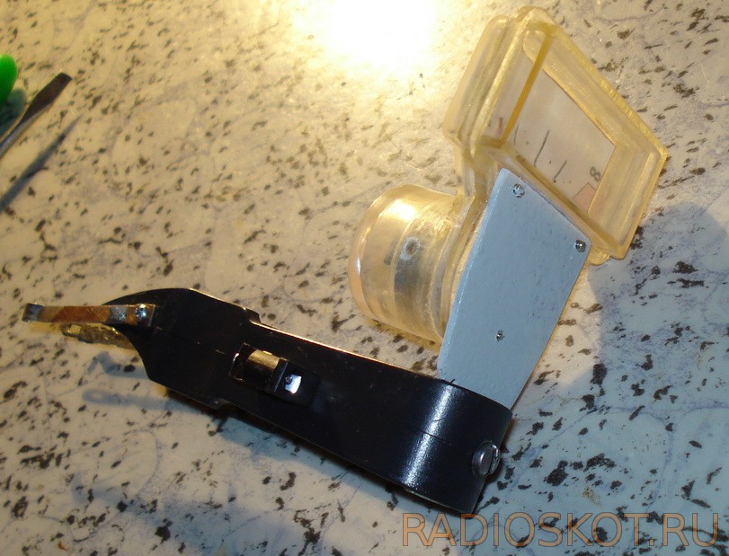 Основным несущим компонентом для монтажа всего и получения, в конечном счете, желаемого выбрал прочный пластмассовый пинцет, входящий в набор устройства для производства оттиска печати на документах (наборная печать). К нему, при помощи металлической пластины, прикрепил индикатор от магнитофона М4762 предназначенный для работы в вертикальном положении шкалы, с током отклонения 220 — 270 мкА, внутренним сопротивлением 2800 Ом, с габаритными размерами 49 х 45 х 32 мм и длиной шкалы – 34 мм. Так же установил на него щупы — контакты и разъём питания.