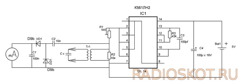 Для согласования введен элемент DD1.3. Для увеличения мощности импульсов с генератора в схему введены элементы DD1.4…DD1.6. Далее сигнал проходит через делитель напряжения на резисторах R2 и R3 и поступает на исследуемый конденсатор Сх. Блок измерения переменного напряжения содержит диоды VD1 и VD2 и мультиметр, в качестве измерителя напряжения, к примеру, М838. Мультиметр необходимо перевести в режим измерения постоянного напряжения. Подстройку ESR метра осуществляют путем изменения величины R2.