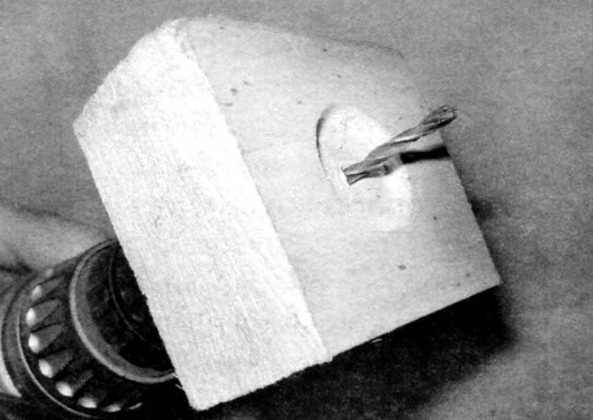 Для сверления отверстий под шканты в торцах стоек, ножек и шпилей изготовил кондуктор из деревянного кубика: в нём перовым сверлом диаметром 30 мм выполнил гнездо глубиной 5 мм и затем просверлил центральное сквозное отверстие диаметром 4 мм.