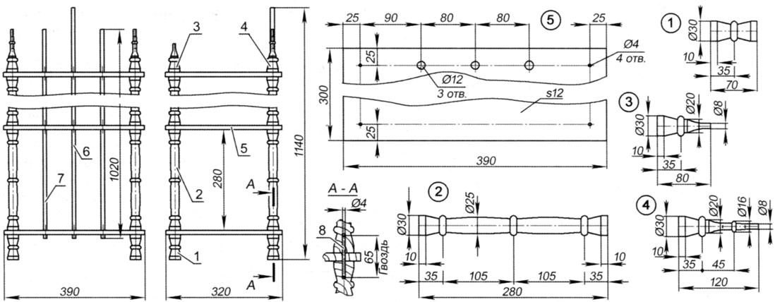 Вот и решил сделать этажерку «по мотивам», но современную. Для этого даже приобрёл токарный станок по дереву. Выполнил чертежи. Купил лист 12-мм берёзовой фанеры и пять берёзовых черенков для лопат диаметром 40 мм.