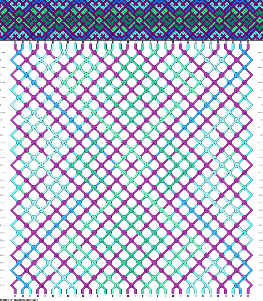 Располагаем нити на рабочей поверхности так, как показано на схеме, чередуя цвета. Закрепляем их одним из описанных выше способов (не забудьте сверху оставить около 10 см ниток для плетения завязок браслета!) и начинаем творить.