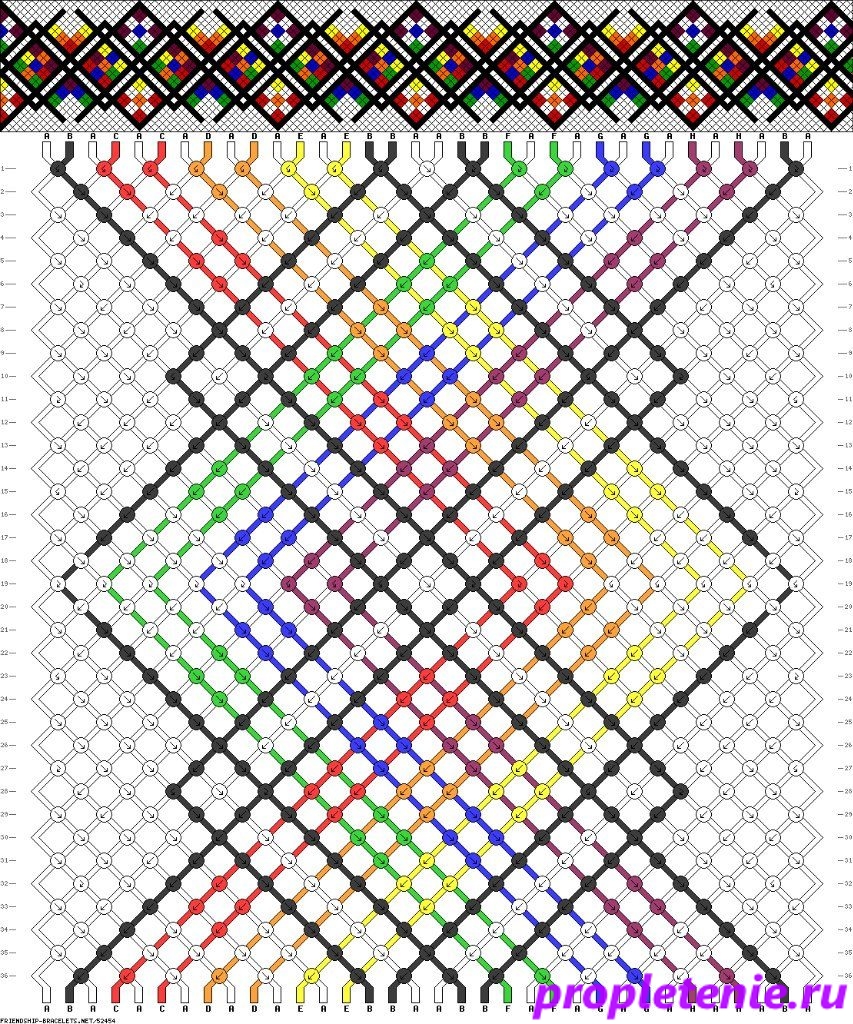 Освоив данную основу, можно приступить к выполнению разноцветных узоров и переплетений. Сложные на первый взгляд схемы всегда отмечены цветами и их дальнейшим перемещением в работе, а также направлением, обозначенным прямыми и изогнутыми стрелочками.