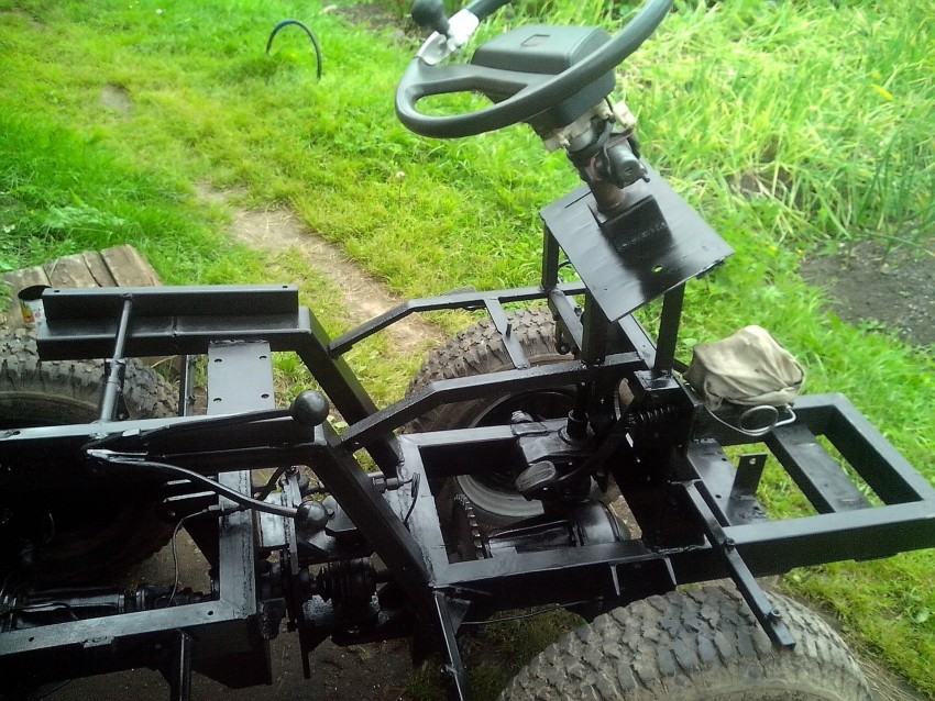 Системы управления начинают делать после установки ходовой части. Рулевое колесо в последовательности установки идёт за монтажом кресла водителя. По нему регулируется высота руля. Он не должен стеснять водителя при управлении техники.