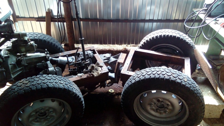 Задний мост можно использовать от старого УАЗа. Его придётся слегка укоротить. К укороченному варианту заднего моста подойдут короткие полуоси.