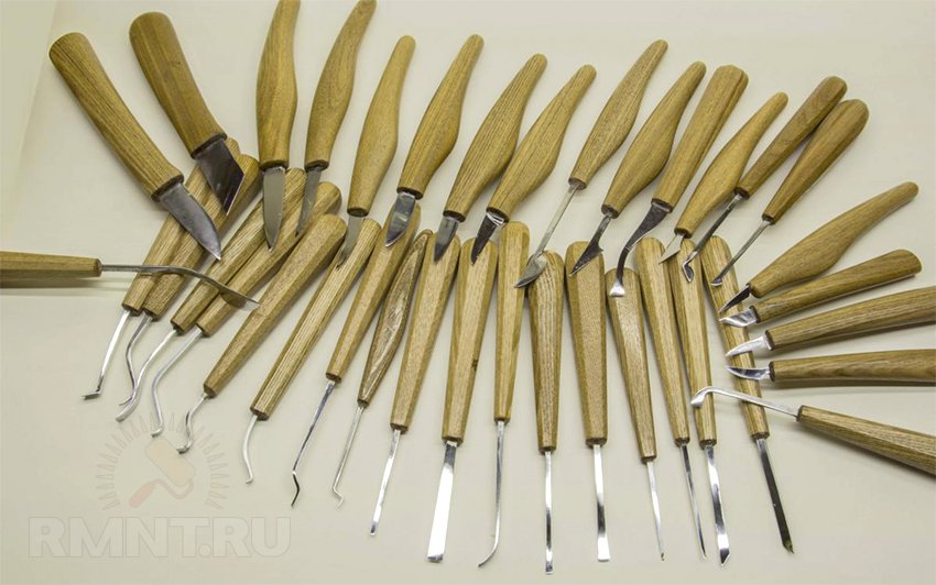 Имея всё необходимое для подготовки деталей к резьбе, необходимо в индивидуальном порядке собрать комплект инструментов для тонкой работы. Основа такого комплекта — набор качественных чистовых стамесок и резцов разных форм и размеров. Можно пойти двумя путями: приобрести средней руки набор из 8-12 предметов, либо покупать по одному-два экземпляра качественного инструмента, недостающих для освоения определённой техники или схемы резьбы.