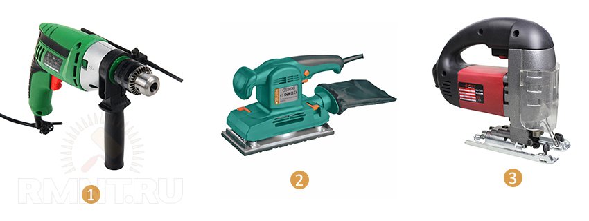 1 — сетевая дрель; 2 — вибрационная шлифмашина; 3 — электролобзик
