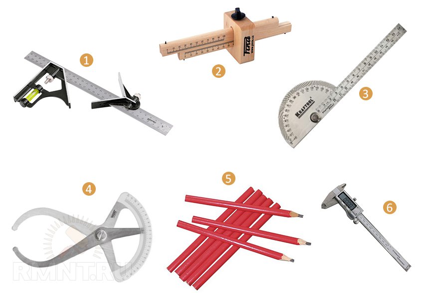 1 — комбинированный угольник; 2 — рейсмус разметочный; 3 — транспортир с линейкой; 4 — кронциркуль; 5 — карандаши строительные; 6 — штангенциркуль